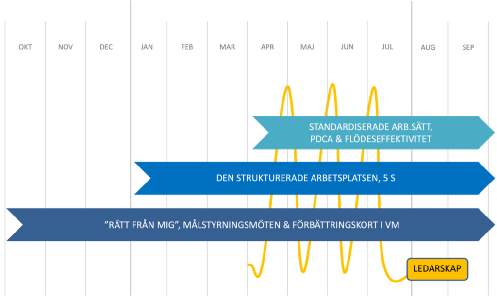 - Löpande träffar med ledarnas respektive arbetsgrupper för korta utbildningsmoment och diskussioner kring varför de olika arbetsmetoderna skulle implementeras. De första månaderna med stöd av verksamhetsutvecklare och konsulter och därefter på egen hand med genom de egna grupp- och arbetsledarna.